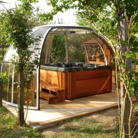 Павильон Spa Dome специально создан для уличной установки мини бассейна спа. Его размеры особенно хорошо соответствую габаритам джакузи среднего размера. Примером могут быть уличные джакузи Nautique и Sojourn.
