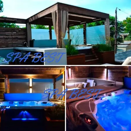 Такое решение добавит привлекательности всей картине. Оно позволит укрыться от палящих лучей солнца. А главное, при необходимости спрячет спа бассейн от обзора с соседнего участка.
