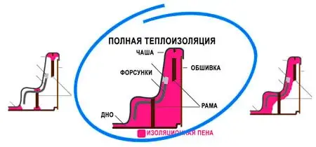 Частичное напыление теплоизоляционного материала на чашу и обрамления или в места наибольшей нагрузки годится только для теплых широт. А именно, для Лазурного Берега или Флориды.