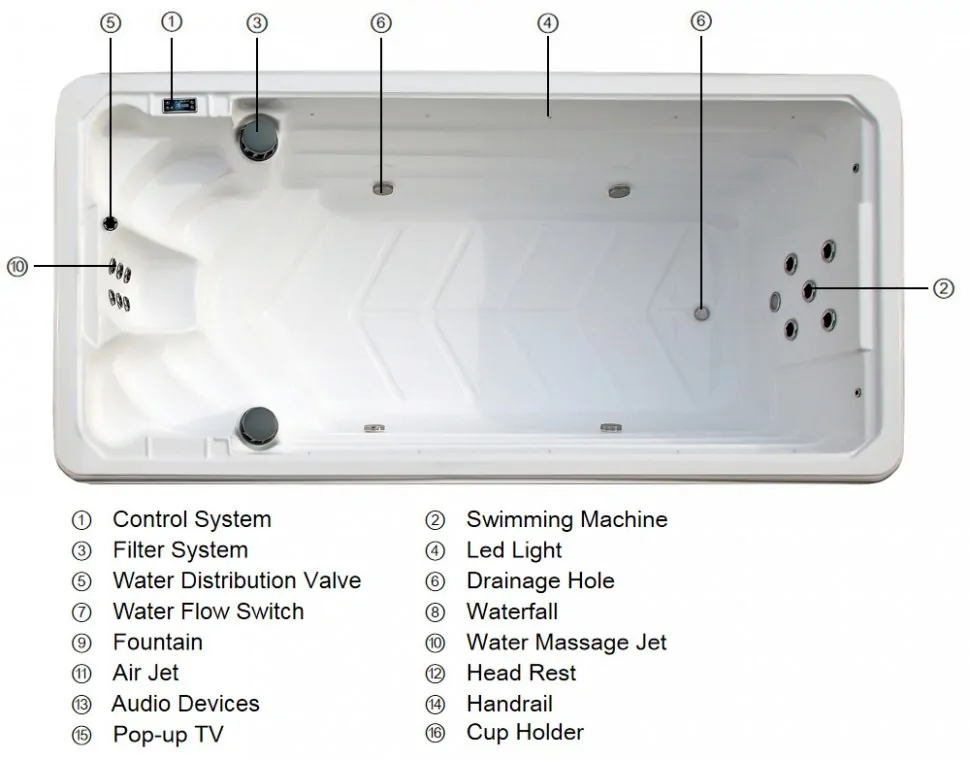 Свим спа укомплектован всем необходимым оборудованием для круглогодичной работы на улице. Новейшая запатентованная технология системы противотока обеспечивает мощный, плавный, непрерывный поток воды для тренировок. Высота форсунок противотока настроена так , чтобы пловец сохранял естественное положение тела во время заплыва.