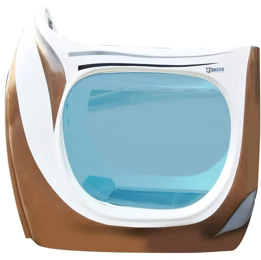 Производитель: Changzhou Bigeer Sanitary Ware (Китай) Чаша и корпус: акриловая чаша и боковые панели (белые) пластиковые поручни боковые акриловые стекла входная дверь с блокиратором переливной бак Оборудование: блок и панель управления автоматический слив/залив воды 8 гидромассажных форсунок хромированные накладки на форсунки подводная подсветка LED гидромассажный насос 1 л.с. циркуляционный насос нагреватель 3кВт озонатор для дезинфекции воды гидравлическая беговая дорожка 3 кВт скорость бега до 14 км/час