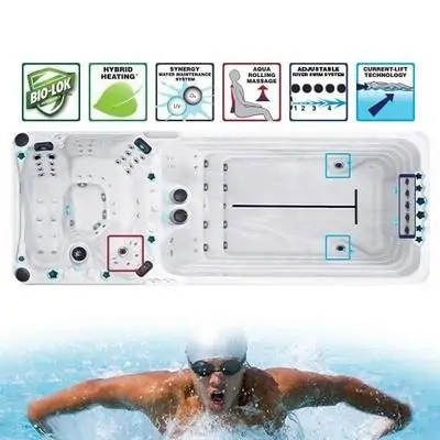 Плавательный Спа бассейн с двумя отсеками имеет очень интересную планировку зоны джакузи. По одной стороне расположили мастер шезлонг для полного массажа тела. Он имеет эргономичный подголовник, большие форсунки в стратегических точках расположения крупных мышц и комфортную конфигурацию ложа. Здесь есть все, чтобы вы могли по-настоящему отдохнуть и расслабиться после заплыва на бесконечную дистанцию.