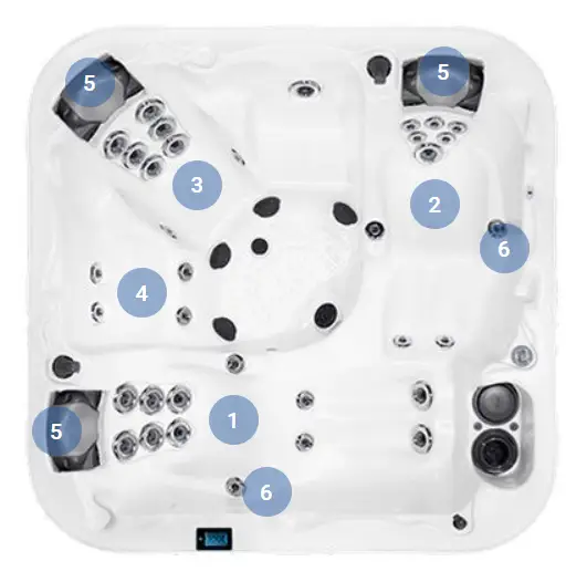 Спа бассейн Diplomat предлагает продуманное размещение для пяти человек. Великолепное ложе для хозяйки джакузи и комфортабельный шезлонг для ее спутника - больше не будет борьбы за лучшее место в спа бассейне!