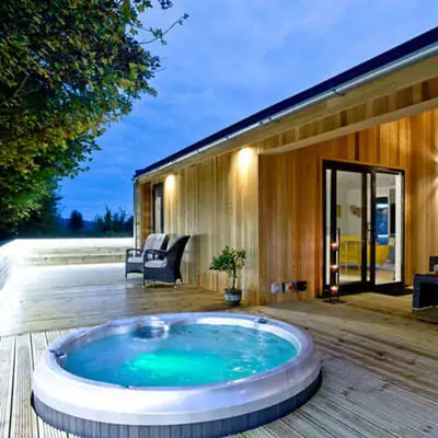 - При желании джакузи несложно заглубить в уровень с полом на террасе загородного дома